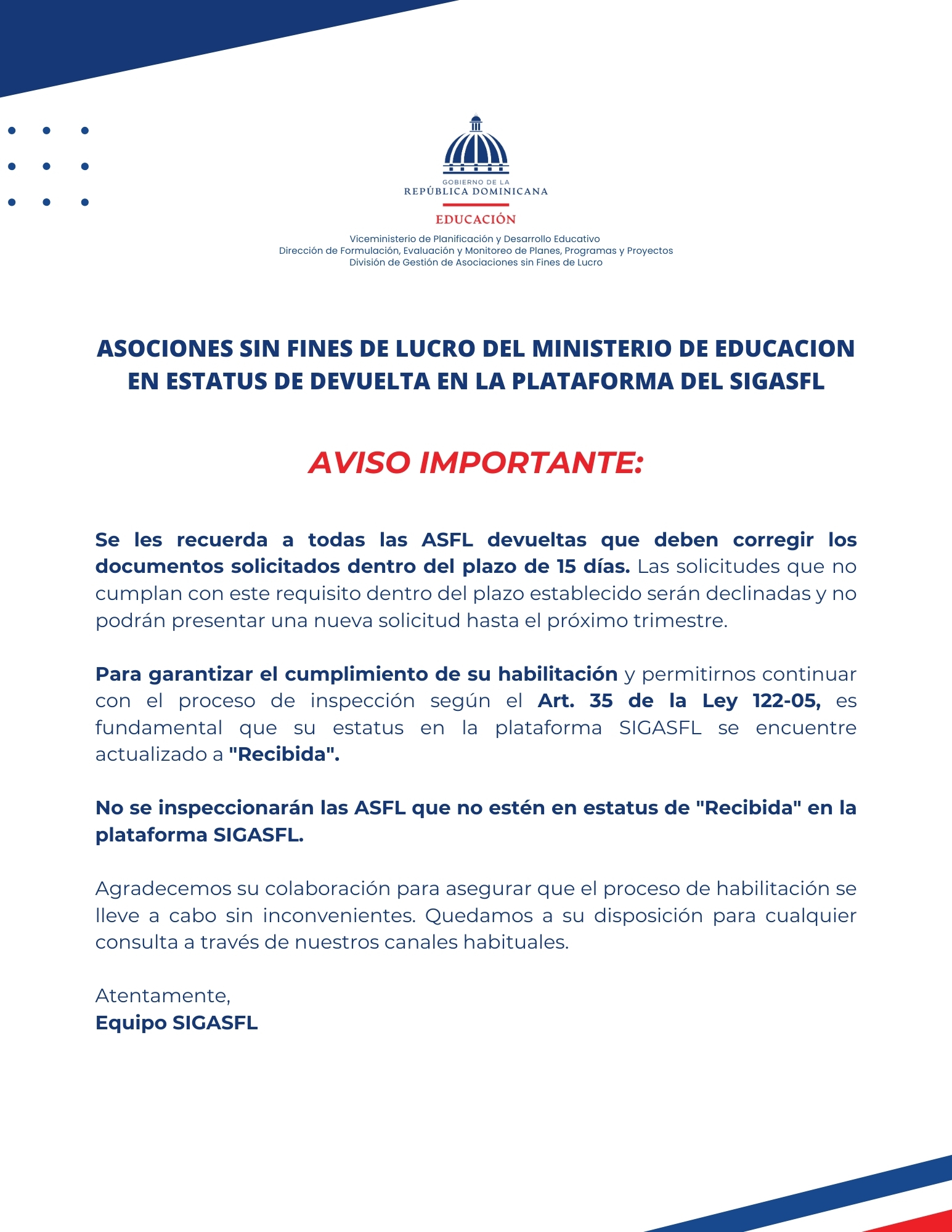 Evaluación del expediente: El expediente será evaluado a fondo, verificando que cumple con la normativa. En caso contrario, el mismo será devuelto a la ASFL con las observaciones de lugar.