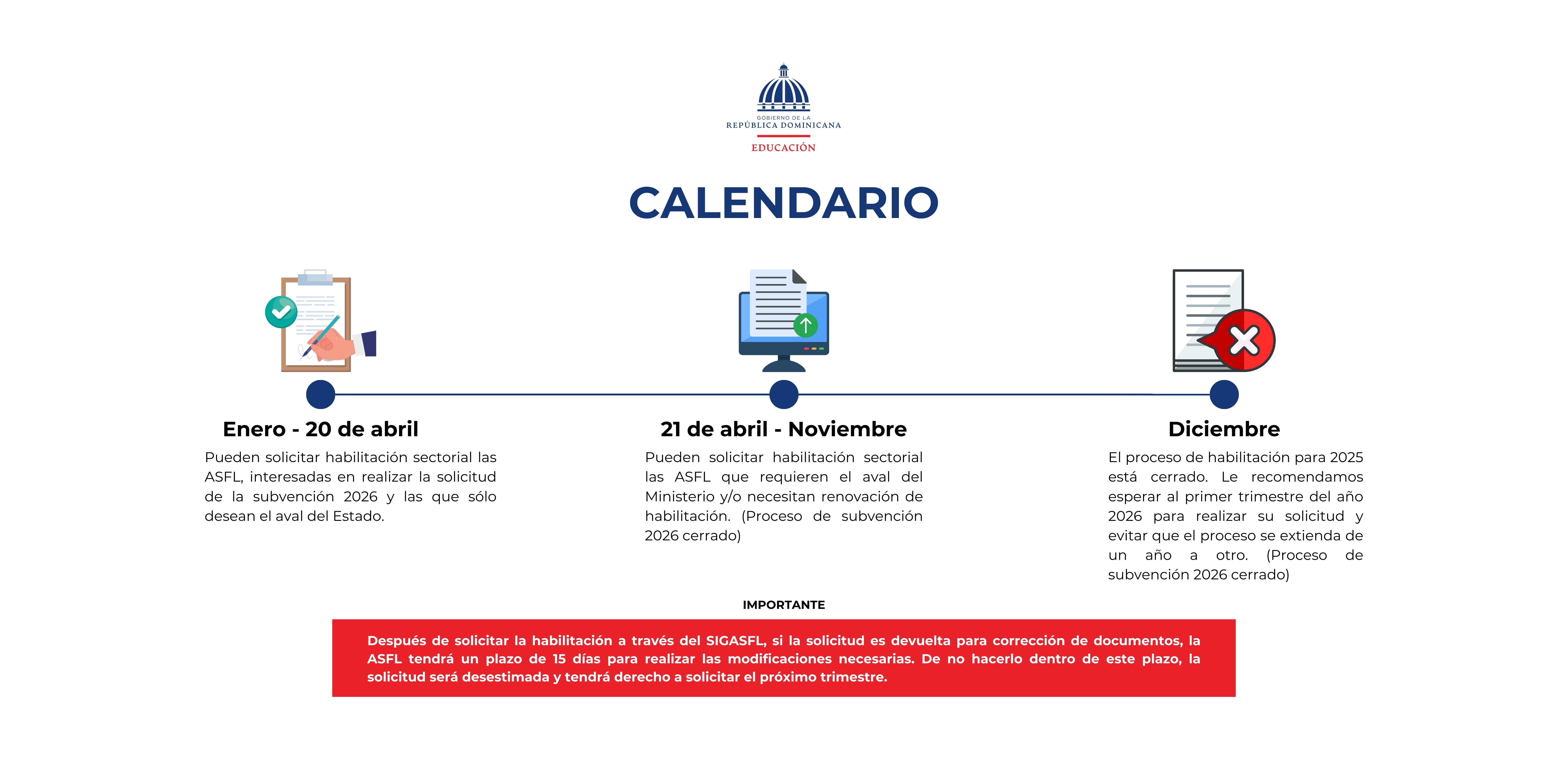 Para dar inicio al proceso de habilitación las ASFL deberán solicitar un usuario y clave de acceso al Centro Nacional de Fomento de las ASFL, la cual es una dependencia del Ministerio de Económica, Planificación y Desarrollo (MEPyD). Una vez que tienen usuario y clave de acceso las ASFL, realizan un pre-registro en el Sistema de Información y Gestión de las ASFL (SIGASFL) para completar el formulario en línea y solicitar la habilitación sectorial.